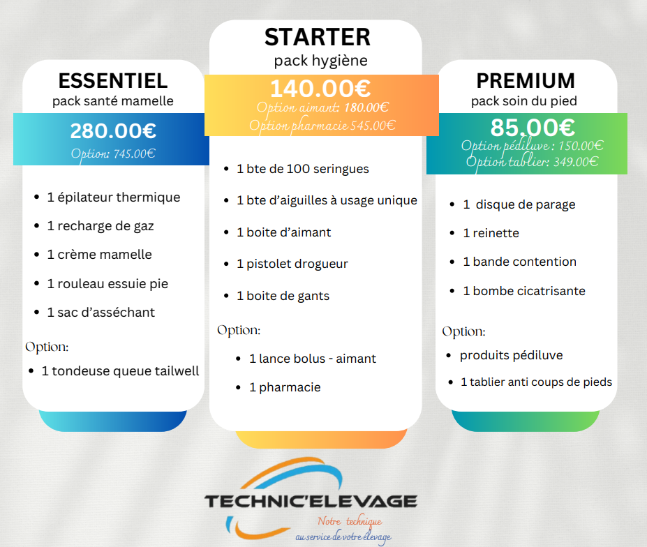 Chaque pack est conçu pour offrir un excellent rapport qualité/prix, avec des options personnalisables selon les besoins de votre élevage laitier.